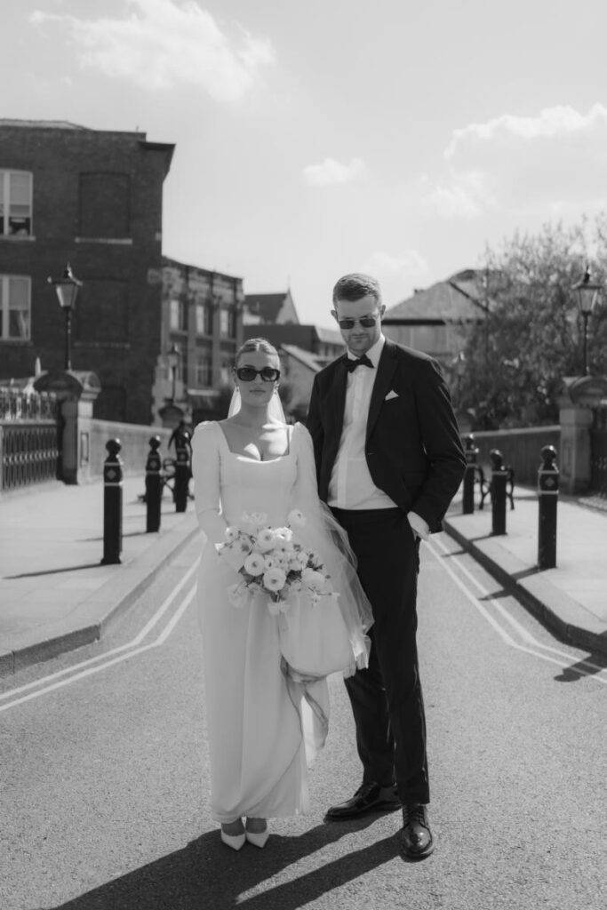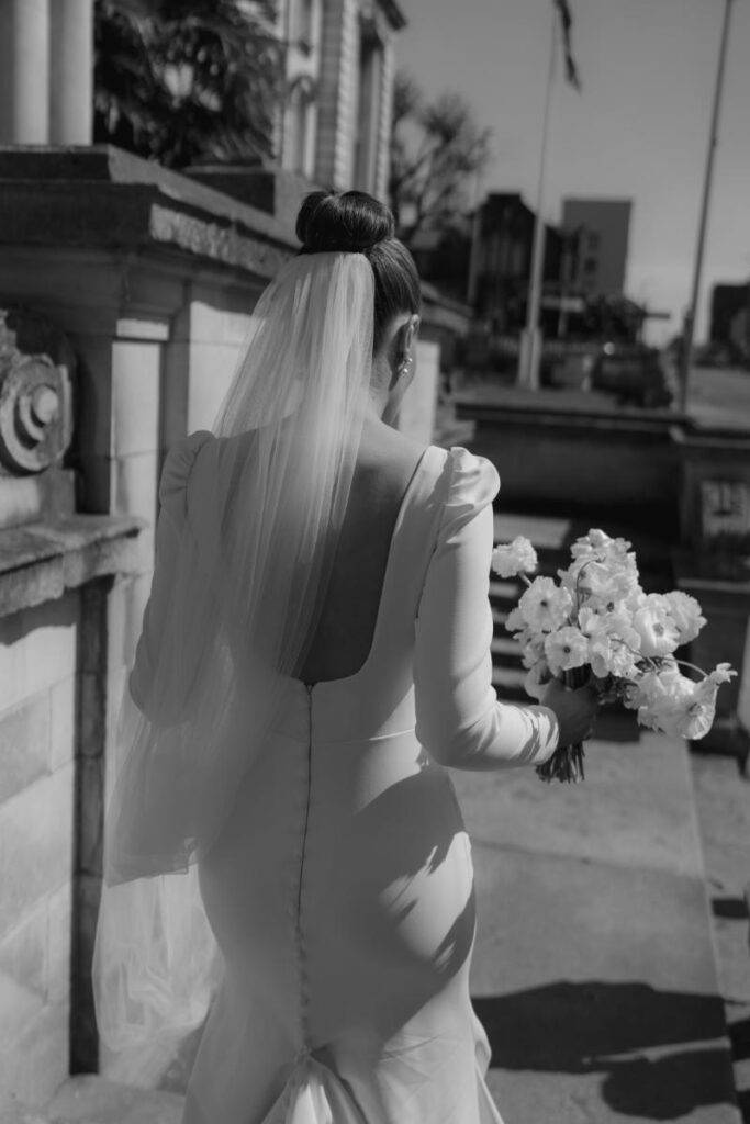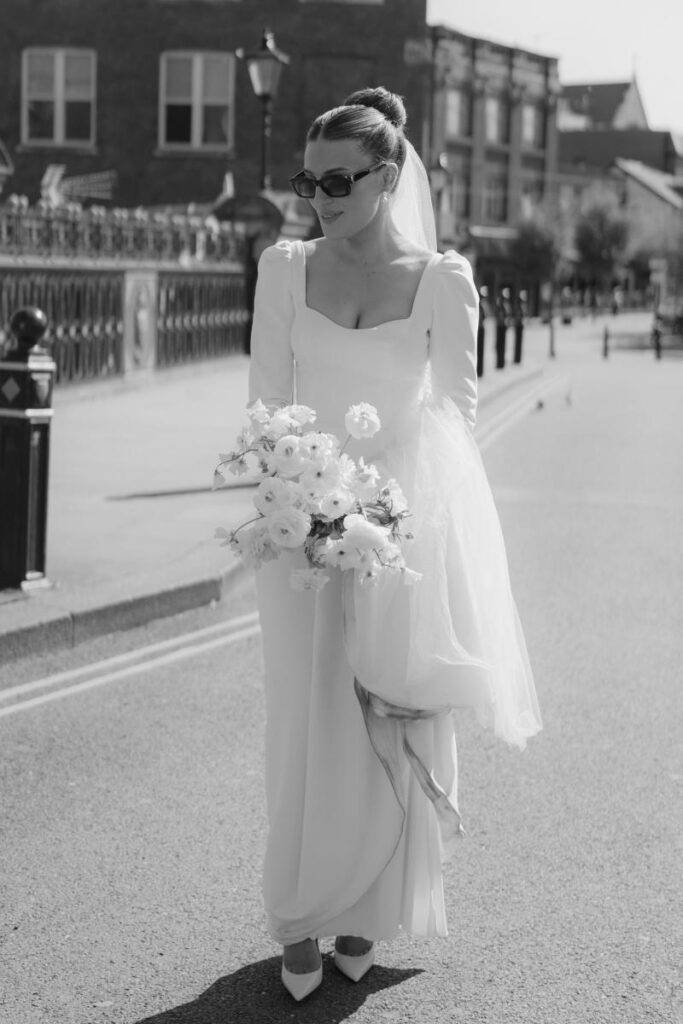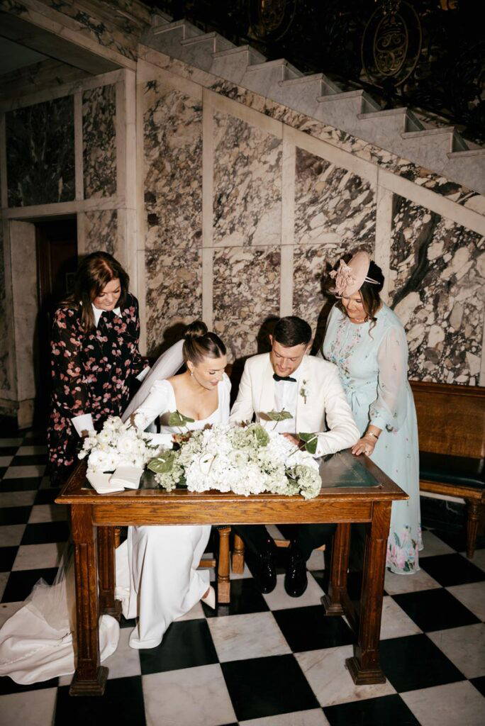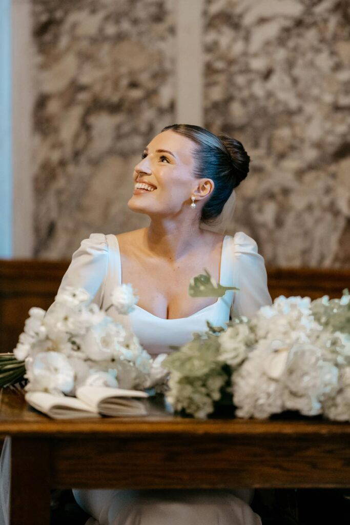 The ceremony at Stockport Town Hall carried an intimate, romantic atmosphere within its stately surroundings. Harriet carried an all-white, textural bouquet that perfectly captured the freshness of the season. A cloud-like mix of sweet peas, ranunculus and other delicate spring florals created a soft, airy silhouette, while subtle variations in texture brought depth and movement to the design. The result was a bouquet that felt modern yet romantic, a beautiful complement to the couples’ contemporary classic theme.