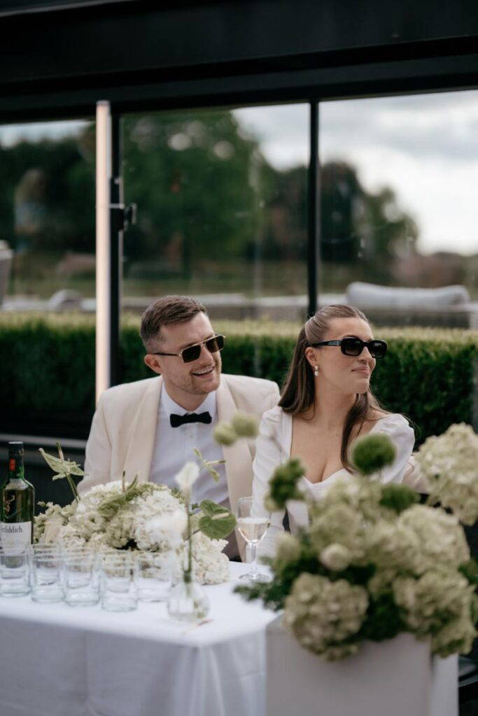 The following day, the celebrations continued at The Colony in Knutsford, where the outdoor terrace set a lively yet stylish reception. The space was transformed with modern floral styling — crisp whites, fresh greens, and sculptural arrangements that brought a serene, early-summer feel.