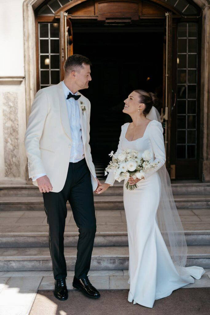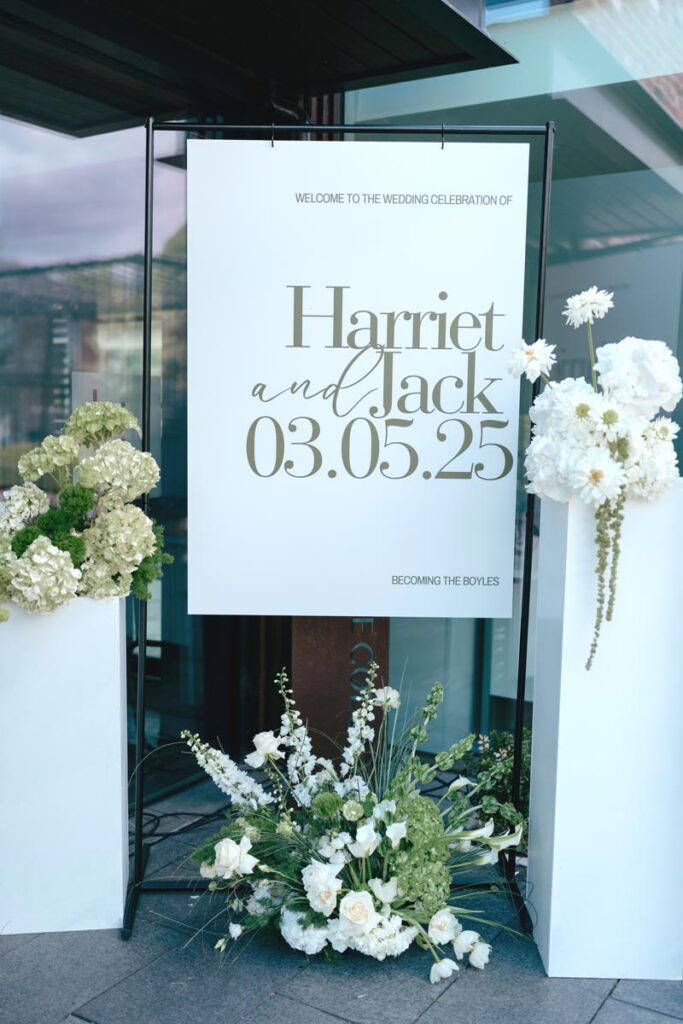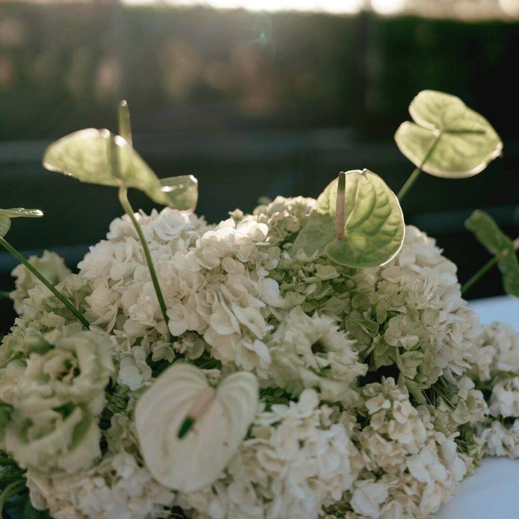 As part of the ceremony, the floral styling followed the same clean, sculptural direction. Lush white hydrangeas formed the foundation of the designs, paired with modern, linear anthuriums that introduced a striking architectural element, creating a refined, contemporary aesthetic setting the perfect scene for Harriet and Jack’s vows.
