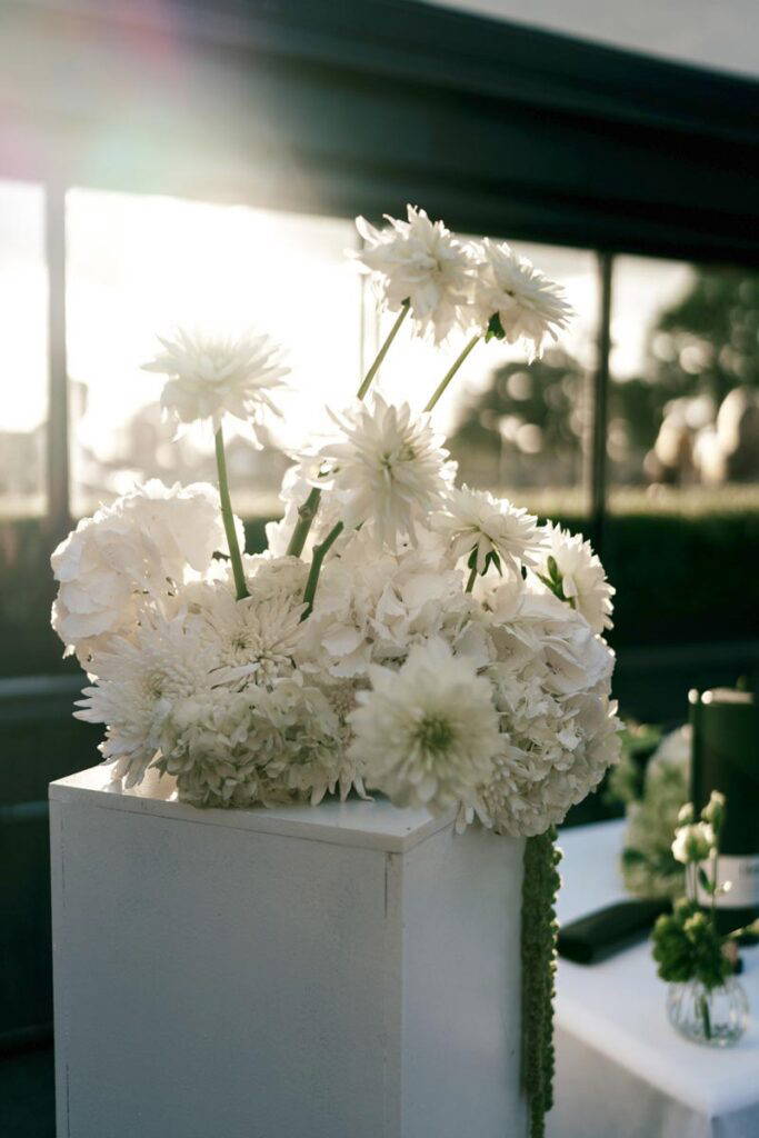 Guests were welcomed into the ceremony space by elegant floral plinths, each adorned with a thoughtfully curated blend of white and soft green blooms. These arrangements combined more textural hydrangeas, delicate spring florals, and sleek, linear stems to create a modern yet inviting entrance. The mix of structure and softness set the tone beautifully- a seamless introduction to the contemporary, fresh aesthetic that carried through the entire celebration.