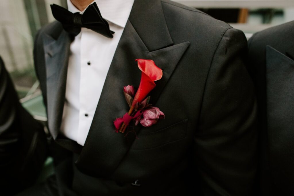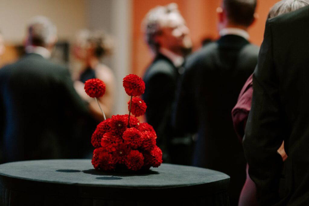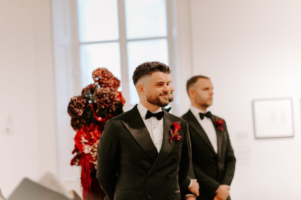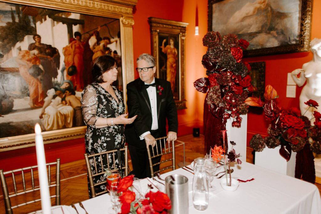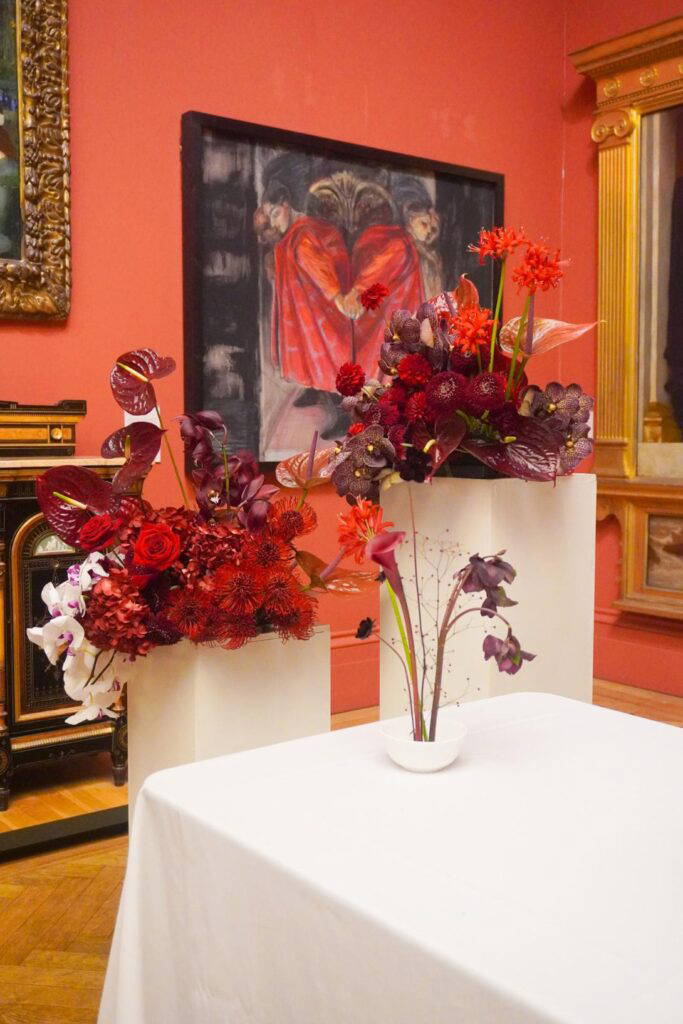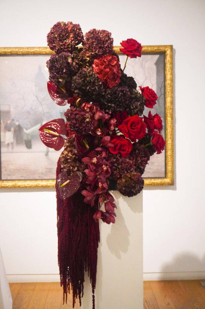 The wedding day itself unfolded with a delightful ceremony in the main gallery room that is packed with both elegance and refinement. The room was adorned with artful floral designs that truly set the stage for this fabulous event. Lush marron and aubergine hydrangeas, tall burgundy anthurium and luxurious hanging deep red amaranthus. A perfect combination to compliment the gallery’s interior. Two statement floral plinth arrangements framed the end of the aisle where R&O exchanged their vows, reminiscent of a renaissance style.