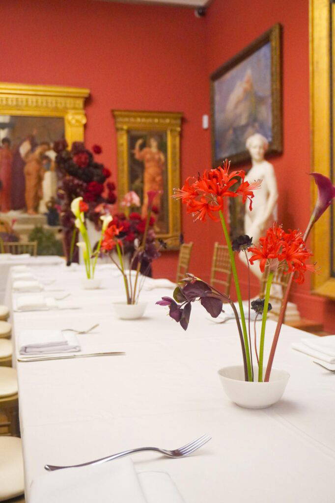 A contemporary ‘U shaped’ table for Rowan and Oliver’s wedding breakfast was held in gallery 12. The set up adorned with masses of blooms of cala lily, nerine, roses, cosmos and delicate locally grown flowers.